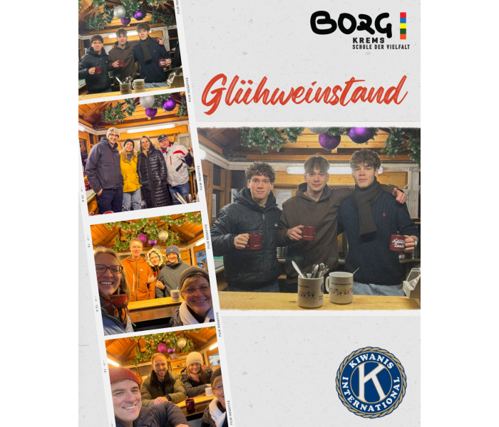 Bereits zur Tradition geworden ist der Tag, an dem das Lehrkäfteteam des BORG Krems im Glühweinstand der Kiwanis in Krems mit anpackt. Auch heuer stand wieder die Zusammenarbeit für den guten Zweck im Vordergrund: Gemeinsam mit sechs engagierten Schülerinnen und Schülern der 8A wurden Glühwein und Punsch ausgeschenkt.